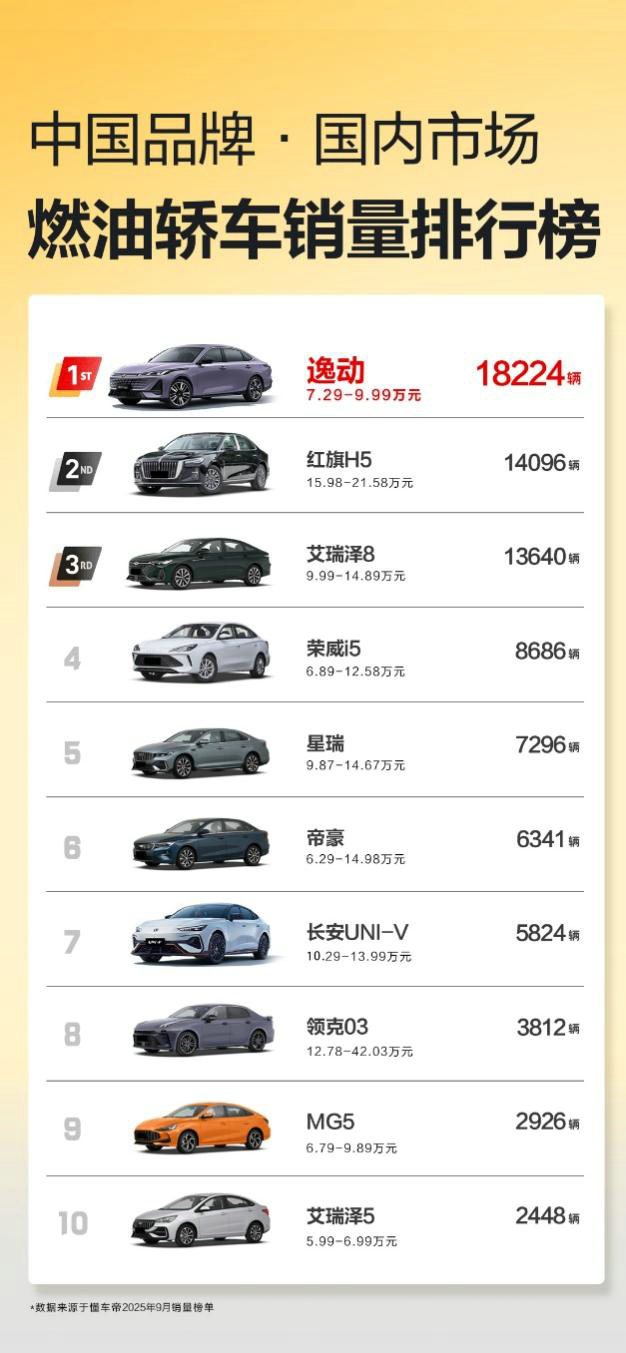2025年以来,逸动系列市场表现持续走强,在竞争白热化的家轿市场中,不仅上半年销量突破10万辆,更在5-9月连续五个月稳居自主品牌燃油轿车销量冠军。这一连串持续领跑细分市场优异的表现,推动逸动从家庭用户的市场选择变为“销量看榜单,好车选长安”的消费共识。