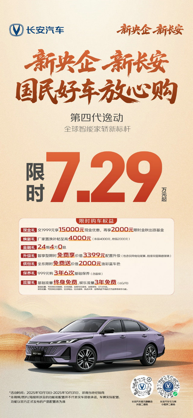 目前,正值“新央企 新长安 国民好车放心购”活动期间,即日起-10月31日,第四代逸动推出了多重购车权益:交1999元享15000元现金优惠, 再享2000元限时金秋出游基金的现金礼;厂家置换补贴至高4000元的焕新礼;24期4万0息的金融礼;999元购3年或6次基础保养(含首保)的保养礼;500Bar智享型限时免费享价值3399元配置升级 (包含驭风电动尾翼和前排双层隔音玻璃) 的升级礼;全系限时免费送价值2000元逸彩蓝车色的缤纷礼;基础流量终身免费,娱乐流量3年免费(6G/月)的流量礼;限时价7.29万元起!