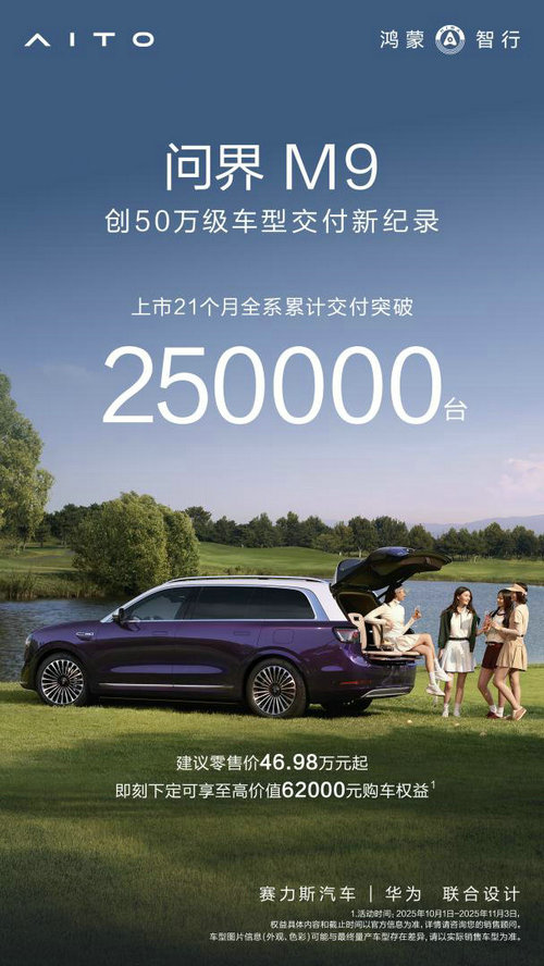 25万辆,是一个里程碑,也是一个新起点。问界M9的成功,印证了中国品牌在高端市场,已具备与传统豪华品牌同台竞技的实力与底气,这不仅是单一产品的胜利,更是以“科技+豪华”双轮驱动构建起的价值体系的胜利。在“智慧重塑豪华”的品牌理念指引下,问界M9将继续深耕高端市场,为用户带来持续领先的新豪华出行体验。